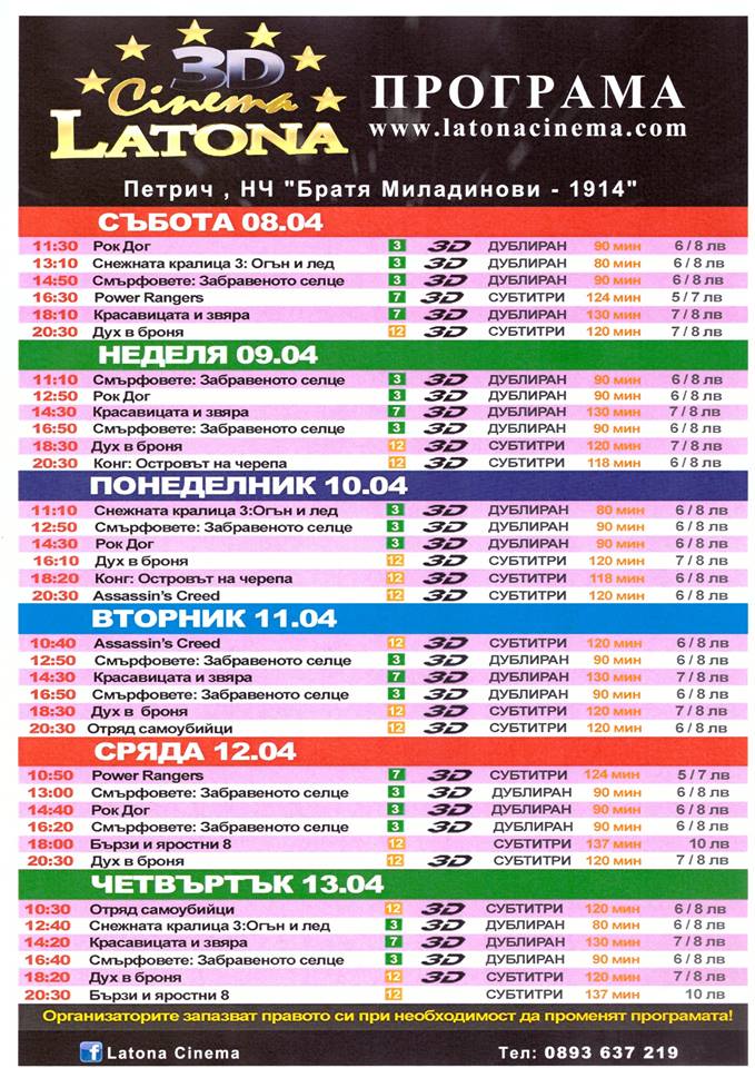 В малкия салон на читалище „Братя Миладинови - 1914” от 8 до 27 април ще има всекидневни прожекции на 3D кино. Фирмата организатор ще се включи и в благотворителната акция за Мина Опренова от Петрич, дарявайки част от приходите си за операция на очите, от която Мина се нуждае. Прожекции няма да има на 20-ти, 21-ви и 25-ти април.
