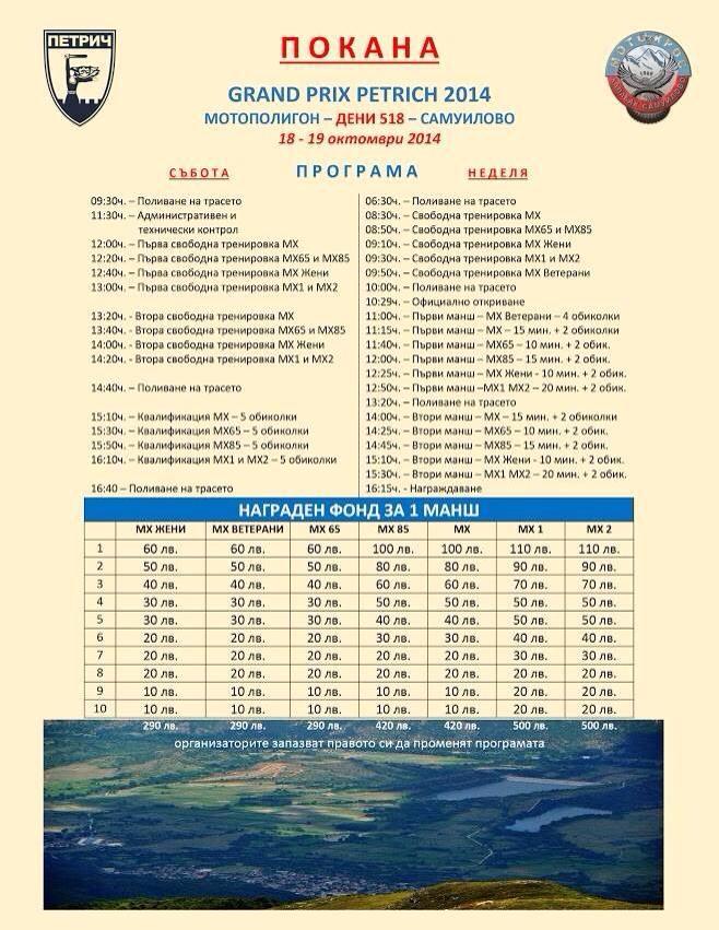 Голямо зрелище очаква любителите на мотокроса през почивните дни. Петричкото село Самуилово ще бъде домакин на мотокрос "Гранд При Петрич 2014г". В събота 18 октомври ще се проведат административно-технически прегледи и свободни тренировки, а официалното откриване на състезанието ще бъде в неделя 19 октомври от 10 часа. Първият от общо 14 старта ще започне от 11 часа. Очаква се на турнира да вземат участие 90 състезатели от България, Македония и Гърция. Повече за подготовката за тазгодишното състезание и затова какво ново да очакват феновете на високите скорости ще разкаже кмета на село Самуилово Кирил Стоянов: