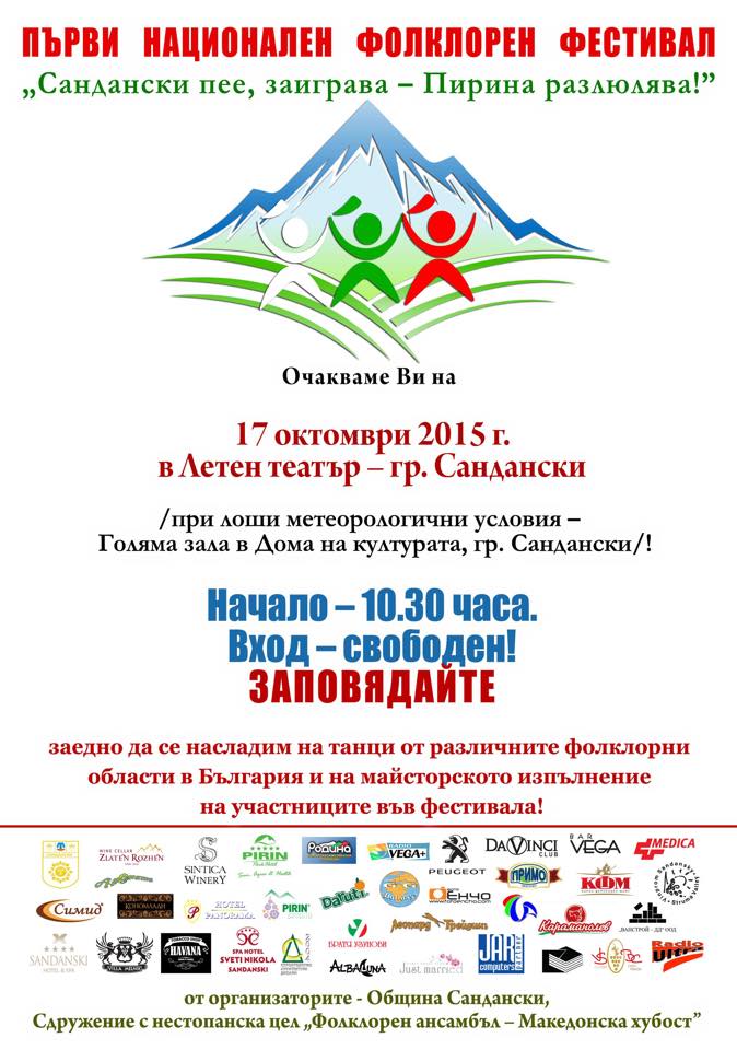 На 17 октомври, събота, от 10.30 ч. в Летния театър на Сандански ще се проведе първият национален фолклорен фестивал „Сандански пее, заиграва – Пирина разлюлява“. Организаторите от Фолклорен ансамбъл “ Македонска хубост“ в Сандански обещават много положително настроение и награди при фолклорното надиграване. Във фестивала ще се включат ансамбли от цялата страна без възрастови ограничения. При лоши метеорологични условия фестивалът ще се проведе в Дома на културата.