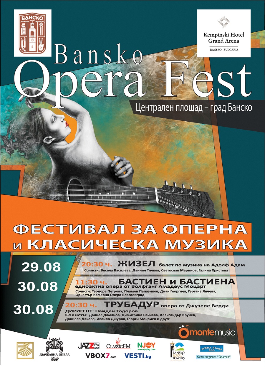 От ManagerДнес започва петото поредно издание на оперният фестивал "Банско Опера фест". Класическа музика ще звучи под откритото небе в града. Амбицията на организаторите от община Банско е да представят продукция на високо професионално ниво за всички гости и жители на курортния град. В първата фестивална вечер зрителите ще присъстват на класическа балетна постановка – Държавна опера Русе ще представи световноизвестният балет “Жизел”. Във втората вечер на фестивала ще се представи операта от Джузепе Верди “Трубадур”. Оперния фестивал отново ще бъде на централния площад в град Банско. Входът е свободен.