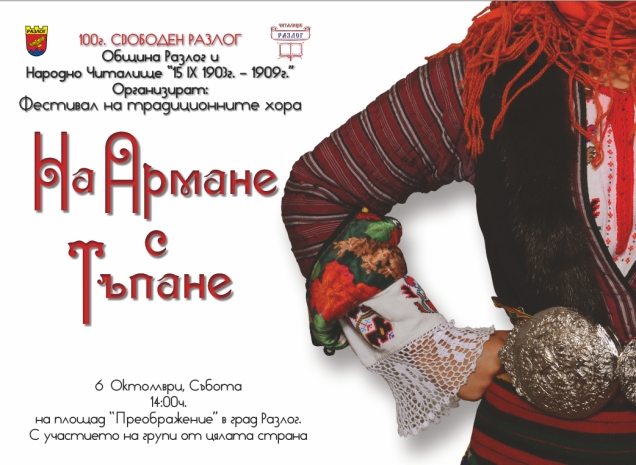 В Разлог стартира танцово надиграване „На армане с тъпане” на 6 октомври. Фестивалът на традиционните хора представлява надиграване на над 200 мъже и жени от различна възраст от клубове за народни танци. Събитието ще започне в 14:00 часа на пл. „Преображение” в Разлог. Организатори са Община Разлог и НЧ „15 септември 1903-1909г.” гр. Разлог. ''Чрез този вид танцуване ще се докоснем до атмосферата на миналото и духа на нашите творци'', коментира инж. Красимир Герчев кмет на Община Разлог. Надиграването „На армане с тъпане” събира групи от цялата страна, с което ще се покаже многообразието на българската фолклорна танцова култура. Участие ще вземат танцови клубове от Разлог, Добърско, Бачево и три танцови клубове от София. В Разлог ще танцуват и хората от танцови клубове към читалище „Жар” гр. Казанлък, „Лукойл Нефтохим” гр. Бургас и „Всички стъпки” с танцьори от Нова Загора и Ямбол.