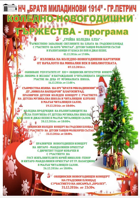 Петрич поставя началото на проявите посветени на коледно-новогодишните празници. Повече от 8 000 лампички тази години ще красят 12-метровата елха на площада в града. Тържественото запалване на светлините ще бъде на 01.12.2016 г. /четвъртък/ от 17.00 часа. Церемонията ще е съпътствана от богата музикално-артистична програма, подготвена от ученици на основните училища в Петрич, възпитаници на Общински детски комплекс и на НЧ „Братя Миладинови – 1914”. Тази година Община Петрич ще аранжира на градския площад сцената на Рождество Христово. Под дървен навес ще бъдат поставени фигурите на Дева Мария и Младенеца, на Йосиф, на цар Ирод и на трите влъхви. Идеята е възстановката на библейското събитие да включва всички персонажи от нощта на раждането на Исус.