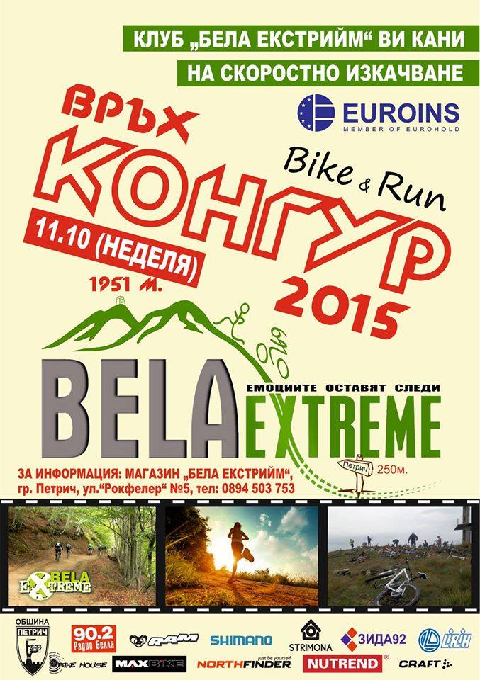 Клуб "BELA Extreme" организира на 11.10.2015г скоростно изкачване на вр. Конгур -1951м. от гр.Петрич . Целите на събитието са да се съберат колоездачи и бегачи от страната и региона,които да се запознаят с красотите на планина Беласица и община Петрич като същевременно се популяризират планинските спортове и колоезденето в региона. Дължината на велoмаршрута е 22.4 км. а на пешеходния е 13км. Стартът ще бъде даден от ПГИТ “ Асен Златаров“ в Петрич, а финалът ще е на връх Конгур. Трасето включва 13, 4 км горски път и 9 км асфалт.