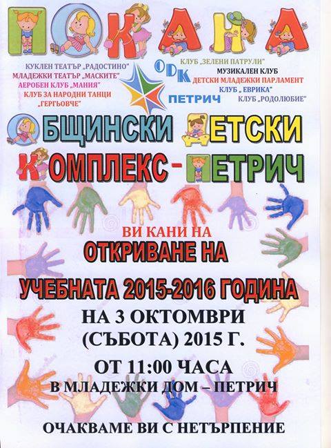 В събота, 3 октомври, от 11 часа, Общински детски комплекс – Петрич открива новата си учебна година и кани всички желаещи да споделят тържеството по този случай. В сградата на Младежкия дом ще стартира програмата, която 10-те клуба към комплекса са подготвили, за да поставят началото на успешна и ползотворна работа с децата през следващите месеци.