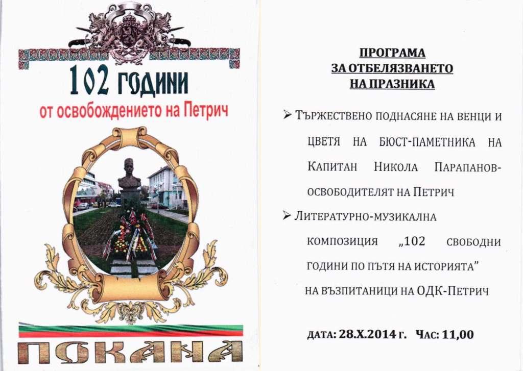 Град Петрич празнува 102 години от своето Освобождение. По този повод на 28 октомври от 11 часа в знак на почит ще бъдат поднесени венци и цветя през паметника на освободителя на града - Капитан Никола Парапанов. Възпитаници на Общински детски комплекс град Петрич ще се включат в отбелязването на празника на града. Децата ще изнесат литературно – музикална композиция, озаглавена "102 свободни години по пътя на историята".