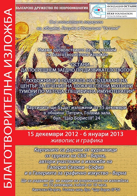 На 15 Декември, събота от 18 часа в залата на Община Петрич ще бъде открита благотворителна изложба в подкрепа на създаването на Референтен център за лечение на злокачествени мозъчни тумори в България. Основна цел на събитието е да се информира обществеността за един от методите за лечение на заболяването, който вече се използва в Европа, както и за възможностите за неговото приложение у нас. Изложбата се организира с подкрепата на Община Петрич, Българското дружество по невроонкология и Фондация Остани. От злокачествен мозъчен тумор у нас годишно се разболяват около 300 души, като преживяемостта на пациентите рядко надхвърля 8 месеца.