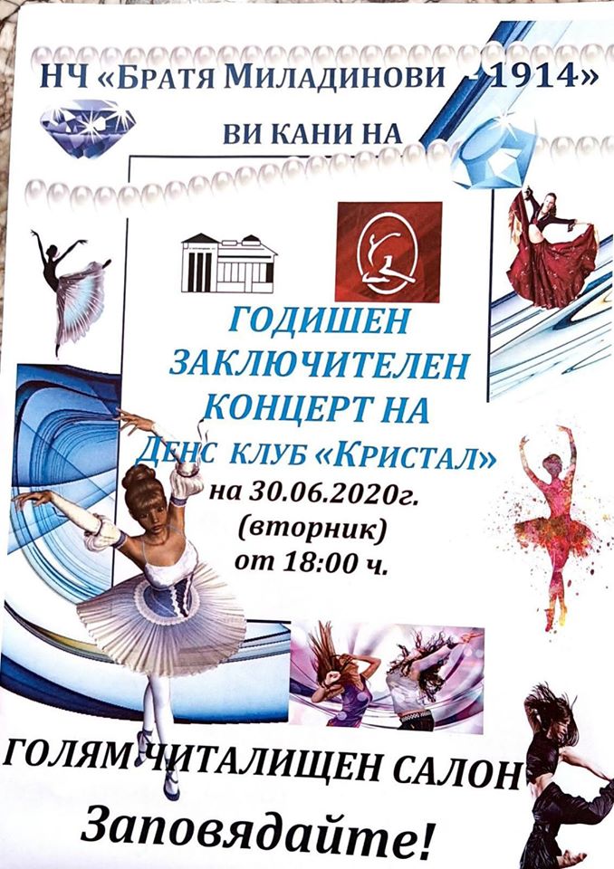 От ManagerНародно читалище „Братя Миладинови – 1914“ – град Петрич организира годишен заключителен концерт на денс група „Кристал“. Концертът ще се състои на 30 юни, вторник, от 18:00 часа в Големия читалищен салон при спазване на противоепидемични мерки.